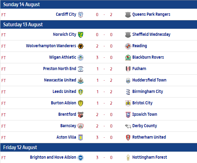 V soboto je bilo odigranih kar 10 tekem. Poln St. James Park je dočakal že drugi poraz Newcastla. Tokrat so srake klonile proti Huddersfieldu. “The Therriers” imajo tako po dveh krogih že 6 točk in so poleg Fulhama, Bristola in Quenns Park Rangersov edini s 100% izkupičkom. Nov Poraz pa je zabeležil tudi Leeds United, ki je bil “prekratek” proti Birminghamu. Aston Villa je doma s 3:0 ugnala Rotherham, zabila sta Gestede dvakrat in enkrat Grealish.