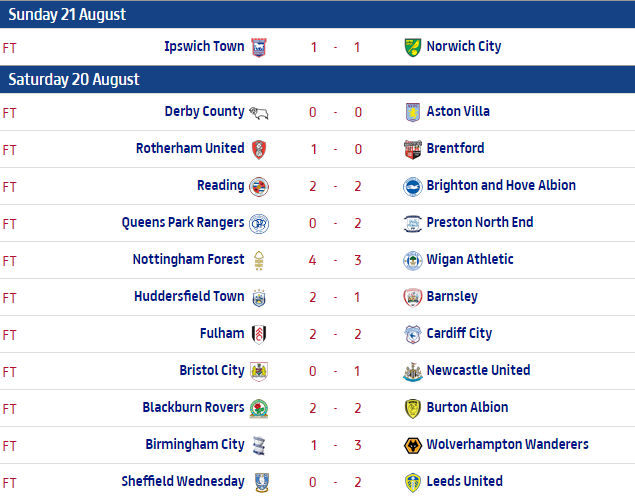 Na tekmi med Derby Countyjem in Villo nismo videli zadetkov, točke sta si delila tudi Reading in Brighton ter Fulham in Caridff City. Formo je očitno našla tudi četa Rafe Beniteza, ki je po zaslugi Gayla premagala Bristol City in se tako povzpela na sedmo mesto.