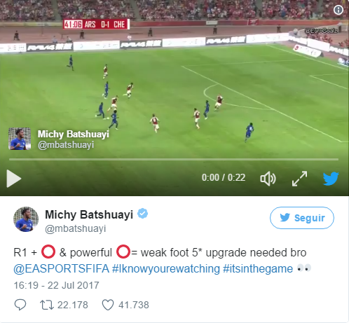 Nemudoma po tekmi je 23-letnik na svoj Twitter profil objavil posnetek svojih dveh zadetkov, pod katerega je zapisal: »R1 + O & močan O = slabša noga 5*, potrebujem izboljšanje«. Napis se seveda nanaša na računalniško igro FIFA, kjer dotična kombinacija tipk pomeni ti. plasiran strel ter močan strel, torej takšna strela s kakršnima je Batshuayi zadel. Belgijec torej zahteva izboljšanje svojih sposobnosti leve, slabše noge, na pet zvezdic, kar je tudi maksimalno možno število.
