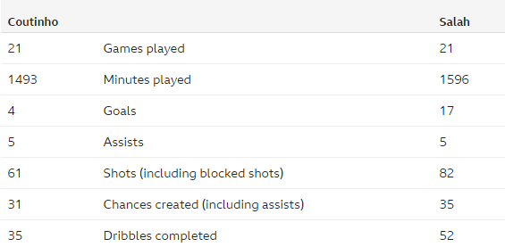 Egipčan se je nedvomno izkazal za enega izmed najboljših nakupov “Redsev” v zadnjih nekaj letih. Na 21 tekmah je uspel doseči že 17 zadetkov, kar v tem trenutku prinaša drugo mesto na lestvici najboljših strelcev v Premier ligi. Pred njim se nahaja samo Harry Kane, z le zadetkom več. Če pa si pod drobnogled vzamemo Salahovih in Coutinhevih prvih 21 Liverpoolovih tekem v Premier ligi, so vsi podatki, z izjemo izenačenih asistenc na strani Egipčana.