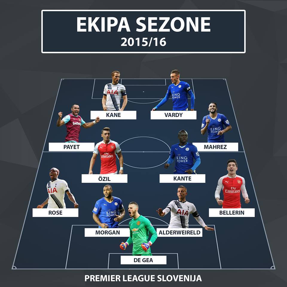 Na spodnji grafiki so prikazani igralci, ki so na posameznih pozicijah dobili največje število glasov. Presenetljivo pa je tudi to, da je enajsterica, ki ste jo izbrali vi, še kako podobna uradni enajsterici leta. V njej pa je le prišlo do ene spremembe v primerjavi z uradno najboljšo enajsterico sezone. Delle Alija (Tottenham) je na poziciji centralnega vezista nadomestil igralec topničarjev Mesut Ozil.