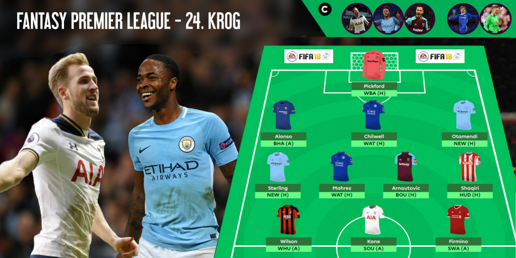 Vezna linija – V vezni liniji je Riyad Mahrez, ki je sodeloval pri kar 53% zadetkov svoje ekipe. Alžirec napada Watfordovo obrambno vrsto, ki je na zadnjih 10 tekmah prejela 21 zadetkov. Ob njem sta v odlični formi Sterling in Arnautović. Sterling je na zadnjih sedmih tekmah zabil šestkrat in podal trikrat, Arnautović pa je enak izkupiček dosegel na osmih tekmah. Sledi še Shaqiri, ki je ključen mož Stokeove vezne linije, saj je sodeloval pri kar 43% zadetkov.