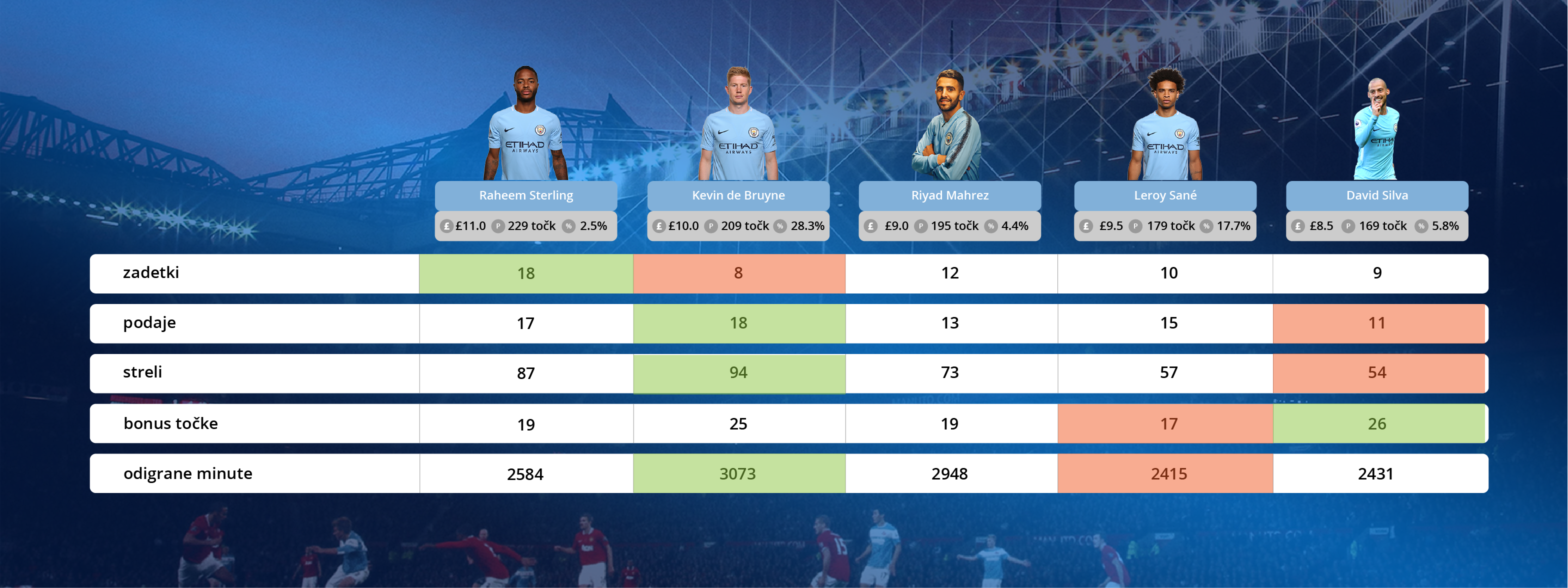 Raheem Sterling (11.0): Angleški krilni napadalec je v lanski sezoni vendarle upravičil investicijo Manchester Cityja in zabil 18 prvenstvenih zadetkov ter dodal še 17 asistenc. V skladu z lanskimi dosežki, je letos njegova cena precej narasla, in ker je vprašanje, če lahko Sterling ponovi lansko sezono, bo zanimivo videti, koliko Fantasy managerjev mu bo dejansko zaupalo mesto v svoji ekipi. Sploh zaradi znamenite Guardiolove rotacije nogometašev. Vsaj na začetku sezone Sterling ni najboljša izbira, saj se šele vrača v proces treningov po svetovnem prvenstvu.