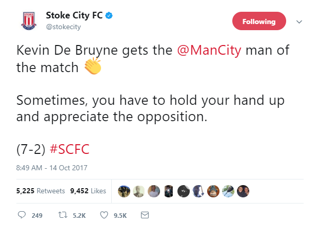 Manchester City je letos v zares izjemni formi, to so znova potrdili tudi danes proti nebogljenemu Stoke Cityju, v mrežo Pottersov je namreč padlo kar sedem zadetkov! Predstava domačih je bila tako izjemna, da je igralcu tekme Kevinu De Bruynu na Twitterju čestital celo uradni profil Stoka.