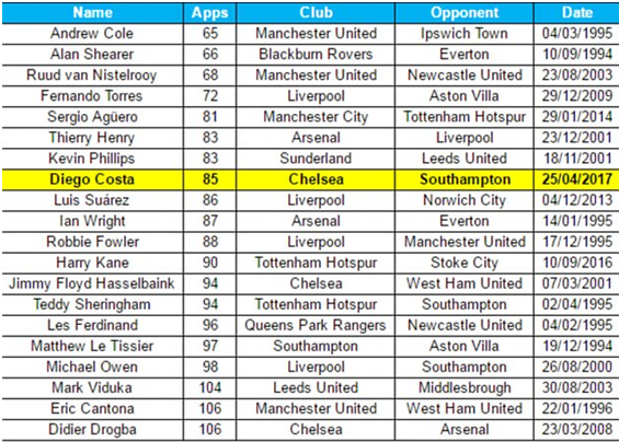 Prvi je Cesc Fabregas, ki se je s svojo 103. asistenco v angleški ligi zavihtel na drugo mesto večne lestvice asistentov, na kateri še vedno kraljuje Ryan Giggs (131). Na novo pa je svoje ime na lestvici igralcev, ki so najhitreje prišli do 50 zadetkov, zapisal Diego Costa. Španski reprezentant brazilskega rodu je včeraj 85. zaigral v dresu Londončanov na tekmi angleške lige, 50 doseženih zadetkov na 85. tekmah pa ga uvršča na 8. mesto lestvice. Na njej zaenkrat vodi Andy Cole, ki je za ta mejnik potreboval le neverjetnih 65 tekem, tekmo več pa je rabil legenda angleškega nogometa in še vedno najboljši strelec vseh časov v angleški ligi Alan Shearer, ki je torej 50 zatresel nasprotnikovo mrežo na 66. dvobojih. Bronasto medaljo zaenkrat drži še en bivši napadalec Manchester Uniteda, Ruud van Nistelrooy, Nizozemcu je dosežek uspel na 68 tekmah. Peterico zaključujeta dva še vedno aktivna nogometaša, Fernando Torres, ki trenutno brani barve Atletico Madrida ter Sergio Aguero, ki svoje veščine kaže v majici Manchester Cityja.