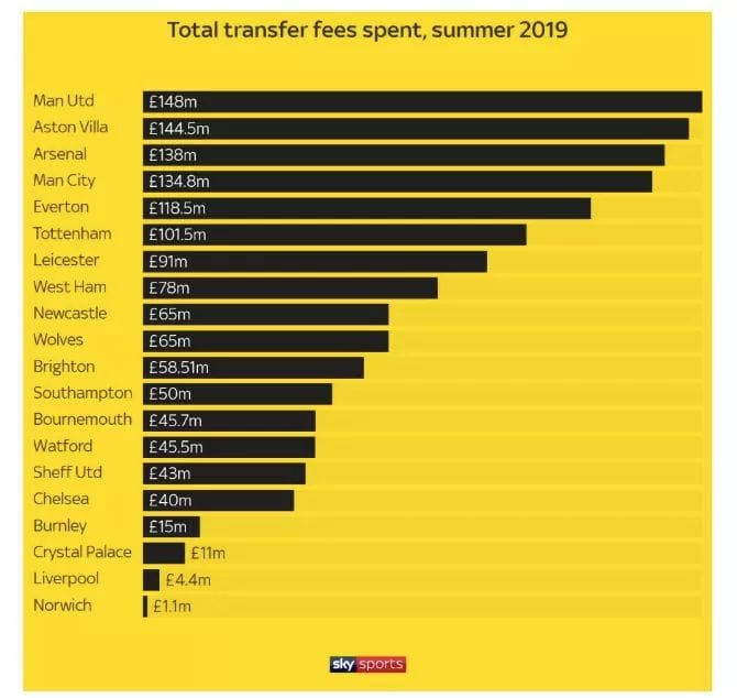 Presenečenje pa je prav tako na dnu lestvice, kjer sta daleč najmanj zapravila Liverpool (4.4 milijonov funtov) in Norwich City (1.1 milijona funtov). Zanimivo je, da se eden nahaja na vrhu drugi pa na dnu prvenstvene lestvice, ampak seveda ima Liverpool veliko bolj kakovostno ekipo kot pa povratniki v ligi, Norwich City.