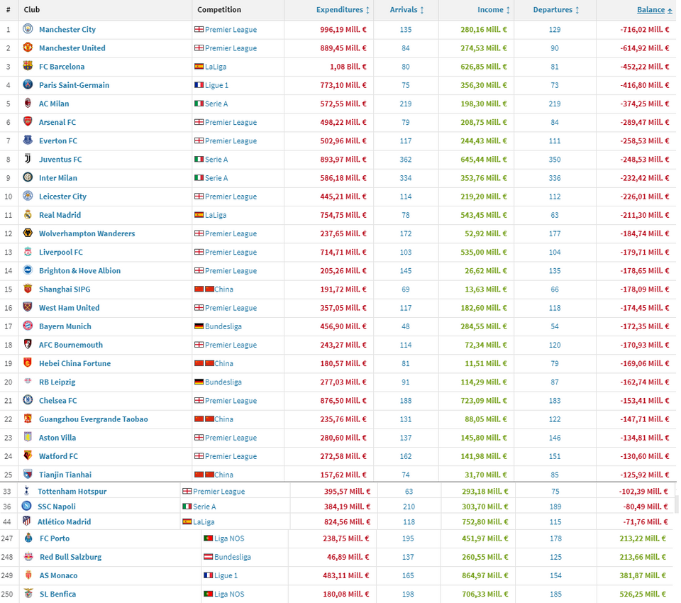 Na spodnji grafiki lahko vidite, kdo je v zadnjih petih sezonah največ zapravil za nove okrepitve. Všteti so vsi prihodi in odhodi določenega kluba. Na vrhu lestvice ‘najbolj zapravljivih’ kraljujeta oba kluba iz Manchestra.