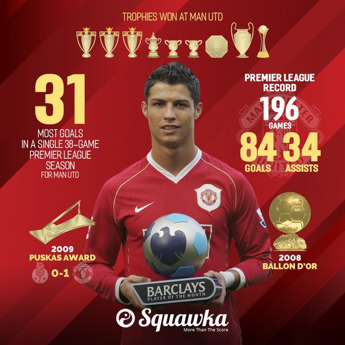 Ronaldo se je, kot že omenjeno, v Manchester United preselil iz rodne Portugalske. Sporting je z njegovo prodajo zaslužil dobrih 13 milijonov evrov, mladenič pa je tako postal najdražji najstnik v zgodovini angleškega nogometa. V šestih sezonah, kolikor jih je preživel v dresu Rdečih vragov, se je uveljavil kot eden najboljših nogometašev sveta, s klubom osvojil, kar se osvojiti da, poleg tega pa pobral še kopico individualnih nagrad, tudi tisto najbolj zaželeno v svetu nogometa – Zlato žogo. Njegova je bila leta 2008.
