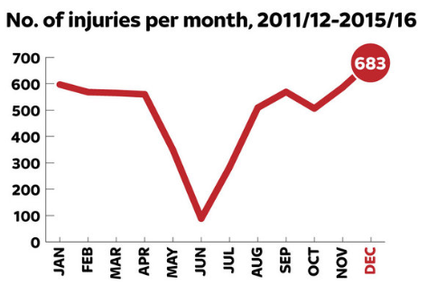 Za konec pa si lahko na spodnjem grafu ogledate še, kateri mesec je glede samih poškodb najbolj kritičen. Razvidno je, da gre za december.