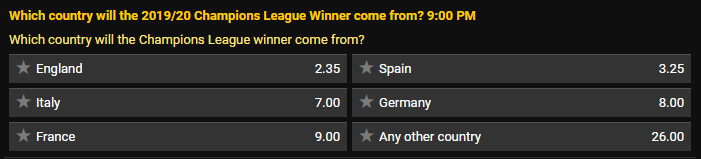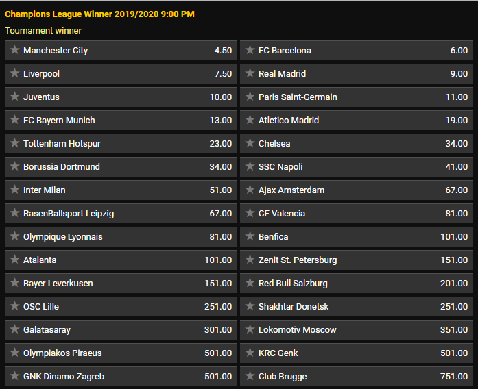 Glavni favoriti za naslov so nogometaši Manchester Cityja, ki imajo kvoto le 4,5. Sledijo jim Barcelona (6), Liverpool (7,5) in Real Madrid s kvoto 9. Tottenham si je lani z uvrstitvijo v finale močno dvignil svojo evropsko vrednost, a Spursi še vedno kotirajo dokaj nizko. Za njihov naslov stavnice ponujajo 23 enot povračila, še nekaj več pa dobite, če stavite, da bo to uspelo Chelseaju (34).