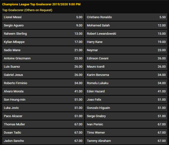 V boju za najboljšega strelca so stavnice zelo previdne. Glavna favorita za to lovoriko sta pričakovano Lionel Messi (5) in Cristiano Ronaldo (5,5). Od ‘zemljanov’ jima je najbližje Sergio Aguero (9). Argentincu pa sledita še dva premierligaša, in sicer Mo Salah (12) ter Raheem Sterling (13).