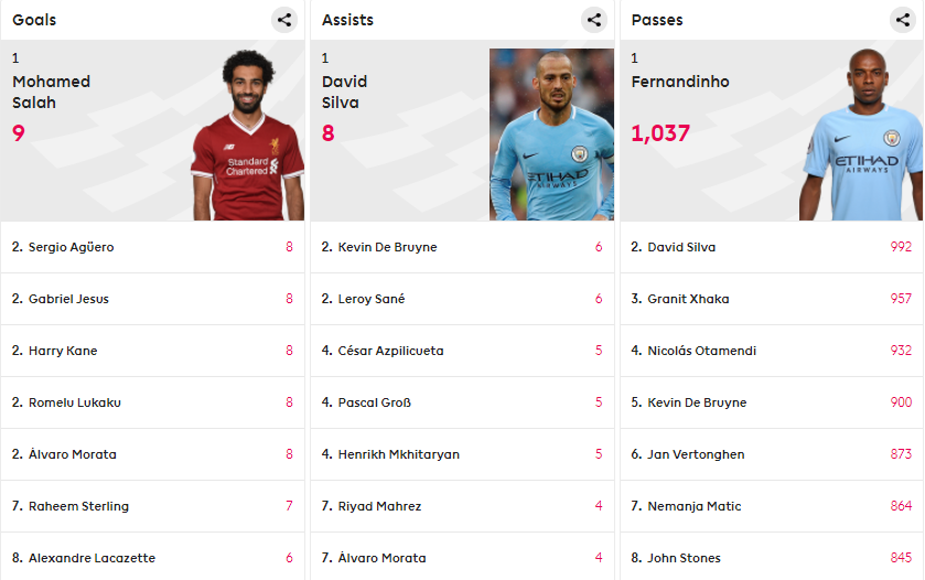 Mo Salah je z dvema zadetkoma novi kralj med strelci z devetimi zadetki, najboljša podajalca pa sta igralca Manchester Cityja, David Silva in Kevin De Bruyne. Tudi pri številu podaj jasno prevladujejo igralci Manchester Cityja.