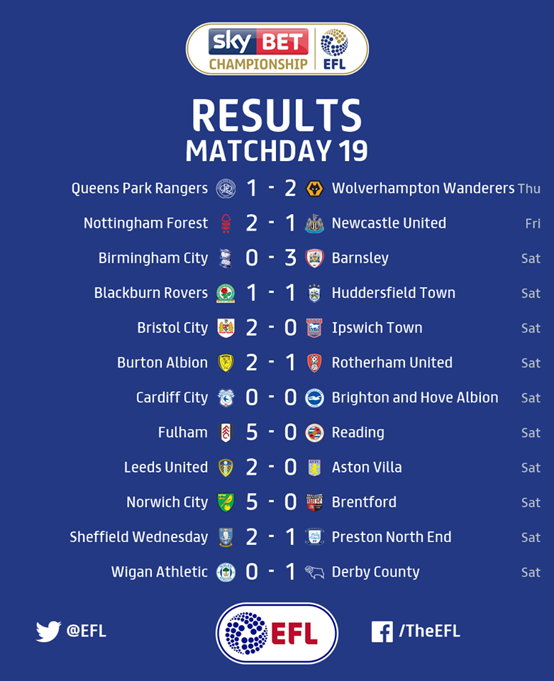 19. krog se je začel že v četrtek, ko je na Loftus Roadu gostoval Wolverhampton. QPR je večino tekme odigral z desetimi možmi, kar so izkoristili pri Wolverhamptonu in domov odnesli vse tri točke.