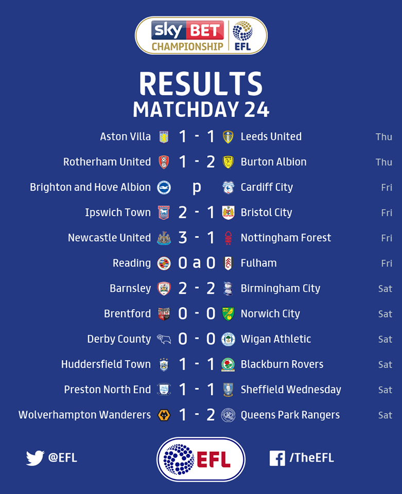 24. krog se je začel že v četrtek, ko smo videli dve tekmi, na Villa Parku je gostoval Leeds United, ki je povedel, a na koncu domov odnesel točko, za Villo je v zaključku tekme izenačil Kodija. Na drugi četrtkovi tekmi je Burton Albion premagal Rotherham in tako zabeležil zelo pomembne tri točke v boju za obstanek.