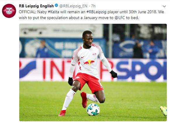 »Naby Keita bo v RB Leipzigu ostal do 30. junija 2018. Govorice o odhodu v Liverpool lahko utihnejo.« Druga ekipa nemškega prvenstva je na Twitterju tako jasno in glasno sporočila, da bo 75 milijonov evrov vreden prestop moral počakati še pol leta.