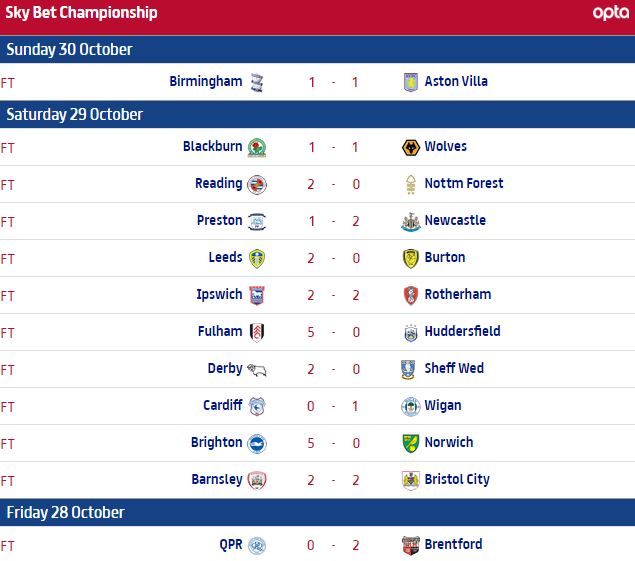 Zelo pester spored nas je čakal tudi v soboto, ko smo videli kar deset tekem, na le-teh pa kar trideset golov. Visoko je v gosteh pri drugemu Brightonu izgubil Norwich City (5-0), z enakim rezultatom je Fulham razbil Huddersfieldu Town. Novo zmago je kljub ne najbolj blesteči predstavi zabeležil Newcastle, ki je na krilih Mitrovića premagal Preston. Pomembno zmago je zabeležil tudi Leeds United, ki se nahaja na devetem mestu in za mesti, ki omogočajo ‘play-off’, zaostaja le eno točko. Na šestem mestu se trenutno nahaja Bristol City, ki je v tem krogu remiziral proti novincu Barnsleyju. Remizirala sta tudi Blackburn in Wolverhampton (1-1) ter Ipswich in Rotherham United, ki je v velikih škripcih, saj ima po petnajstih tekmah na računu vsega sedem točk in zaseda zadnje mesto.