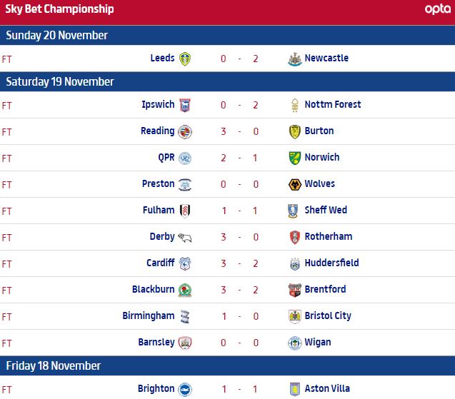 Še pogled na lestvico, kjer je na vrhu Newcastle, šest točk manj ima Brighton, sledi mu Reading, ki pod vodstvom bivše legende Manchester Uniteda (Jaap Stam) igra izjemno. Na četrtem mestu je Huddersfield, ki je v zadnjem času v katastrofalni formi, na mestih za play-off sta še Birmingham ter Norwich. Na zadnjem mestu je Rotherham, ki je od rešilnih mest oddaljen že kar enajst točk. V coni izpada trenutno tudi dva bivša premierligaša, Wigan ter Blackburn.