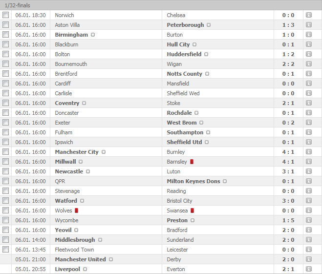 Kot že rečeno, je danes na zelenico stopilo enajst ekip iz Premier League, katerih uspešnost je bila nekoliko boljša od polovične, štiri ekipe si bodo napredovanje morale priboriti na ponovljeni tekmi, opekla pa sta se Burnley in Stoke. Brez večjih težav so tako prvo oviro na poti do naslova preskočili Manchester City, Huddersfield, pri katerem v kadru še vedno ni Jona Gorenca-Stankoviča, West Brom, Southampton, Newcastle in Watford.
