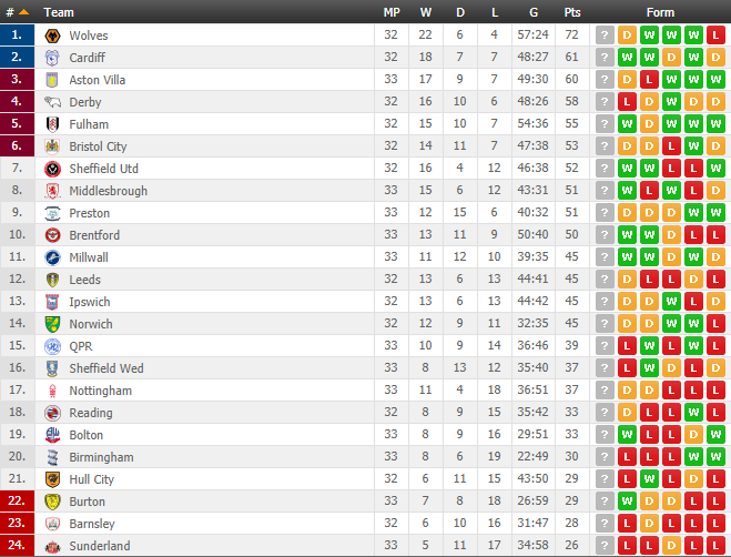 Angleške zelenice tudi med tednom ne samevajo. Večino pozornosti seveda pritegne Liga Prvakov, a v Championshipu klubi ne počivajo. Po približno ¾ odigranih krogov v drugem angleškem prvenstvu se je lestvica že dodobra oblikovala. Kar se tiče samega vrha, je že dalj časa jasno, da bodo Wolvesi iz Wolverhamptona najverjetneje prvaki. Veliko bolj zanimivo je spremljati boje za mesta od 2 do 6 in pa boj za obstanek.
