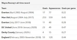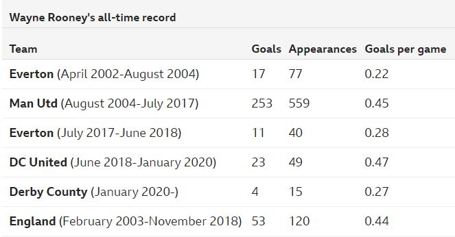 Wayne Rooney je zabil 253 zadetkov v dresu Manchester Uniteda in 53 v dresu državne reprezentance, pri obeh si je prej rekorda lastil veliki Sir Bobby Charlton. Potem ko je prodrl na premierligaško sceno s svojim matičnim klubom Evertonom pri vsega šestnajstih letih, se je Rooney leta 2004 preselil na Old Trafford, kjer je za Rdeče vrage zbral kar 559 nastopov, prav tako pa si je 120-krat nadel dres z reprezentančnim grbom. Rooney trenutno nastopa kot igralec/trener pri Derby Countyju, kamor je januarja prestopil iz DC Uniteda, ki nastopa v ameriški ligi MLS. Rooney je v svoji karieri igral za Everton, Manchester United, DC United in nazadnje Derby County.