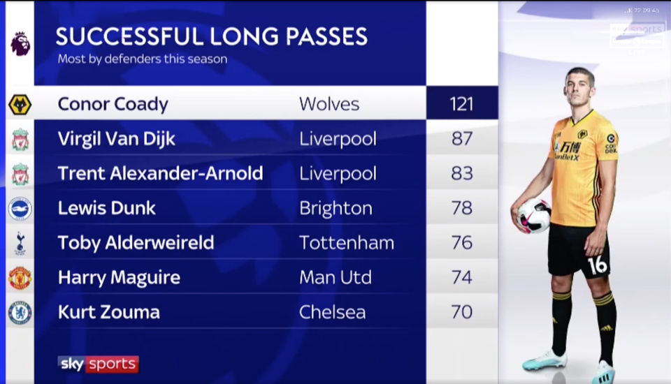 Sky Sports je objavil zanimivo statistiko branilcev z največ uspešnimi dolgimi podajami v tej sezoni Premier League. Z veliko prednostjo presenetljivo vodi Wolverhamptonov Conor Coady, ki je podal kar 34 uspešnih dolgih žog od drugega Virgila van Dijka.